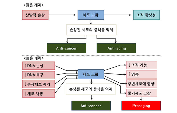 세포 노화는 줄기세포(stem cell)와 전구세포(progenitor cell) 같은 순환 세포들을 고갈시키는 역할도 하는데, 그 결과로 조직의 항상성과 재생은 저해됩니다