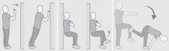 상체 부위의 심부근육을 강화시키려면 벽에서 한 발자국 정도 간격을 두고 서서 두 팔로 벽을 짚을 때까지 상체를 벽 쪽으로 천천히 기울인다.