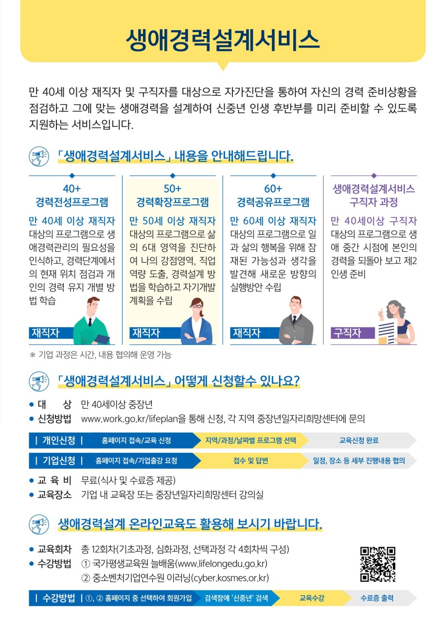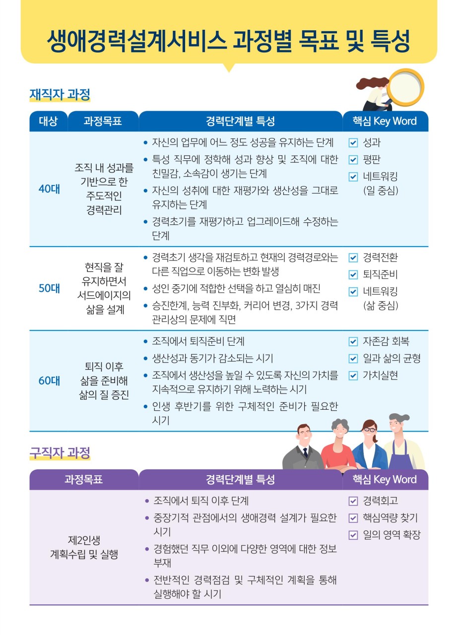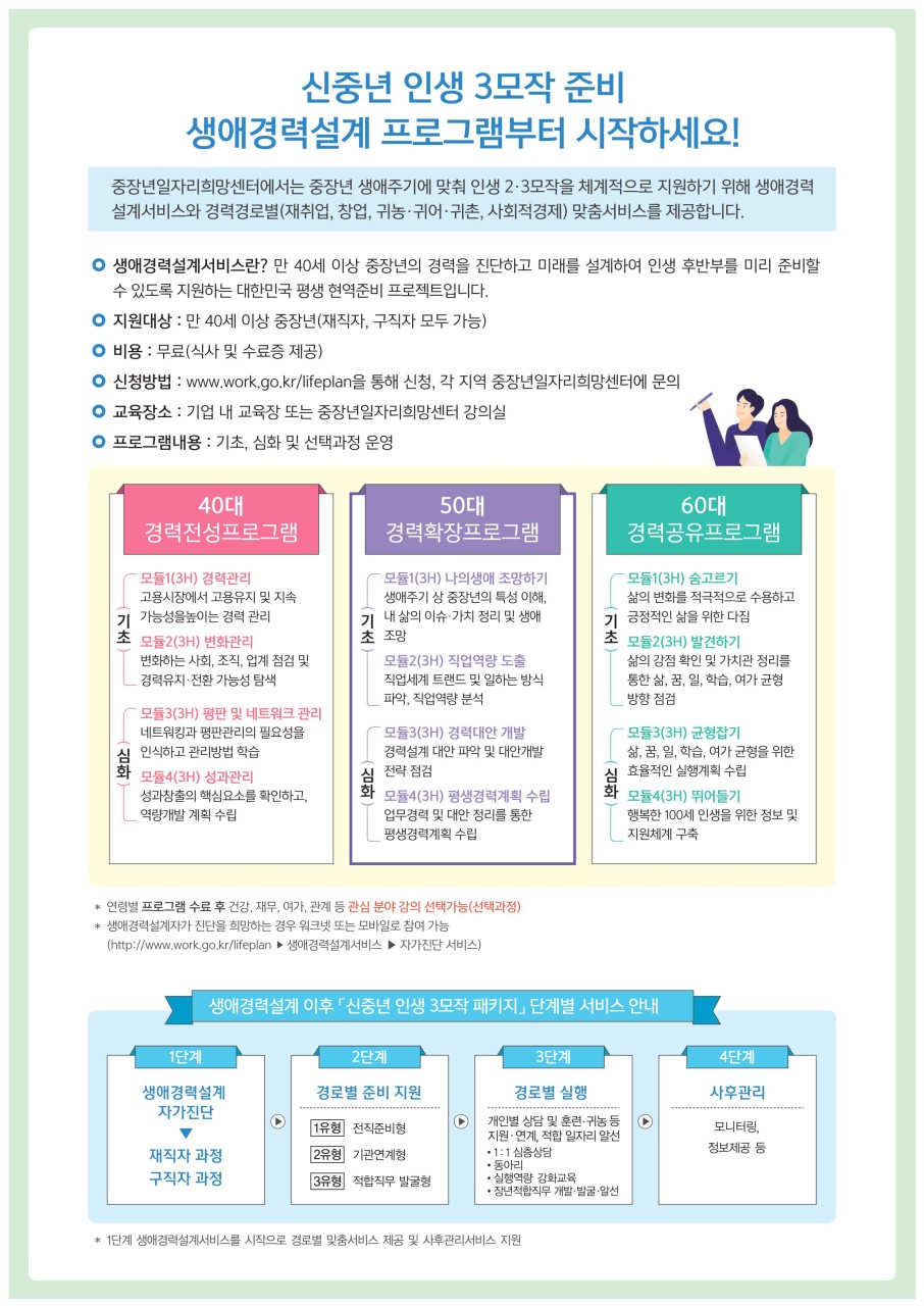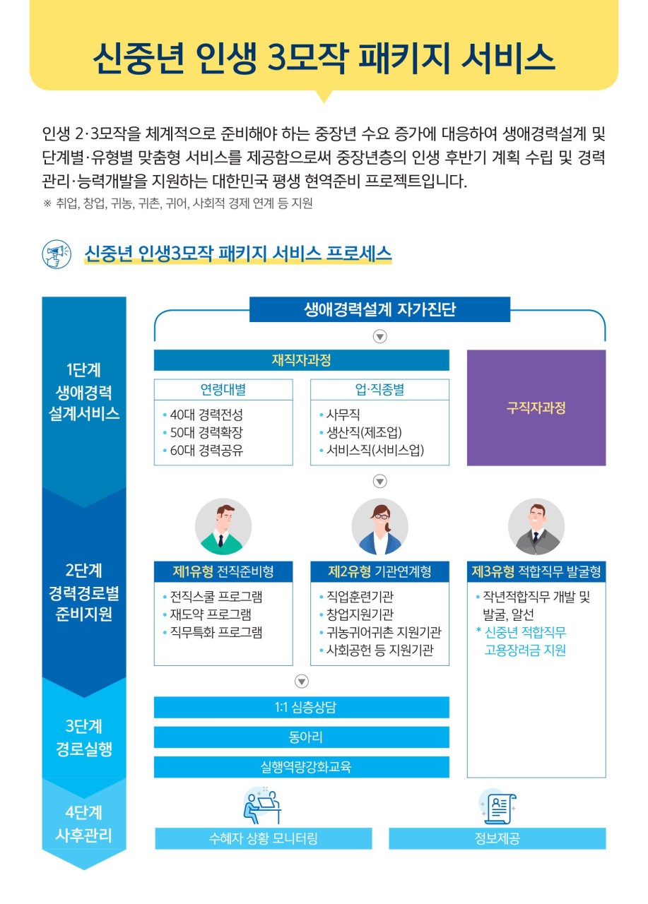 < 신중년 인생 3모작 프로젝트 > 고용노동부, 노사발전재단에서 주관하는 생애경력설계서비스 입니다. 생애경력설계서비스는 만 40세 이상 중장년을 대상으로 현재 보유하고 있는 직업역량을 진단하여 체계적으로 인생 3모작을 준비할 수 있도록 도움을 드리는 고용지원 사업입니다.