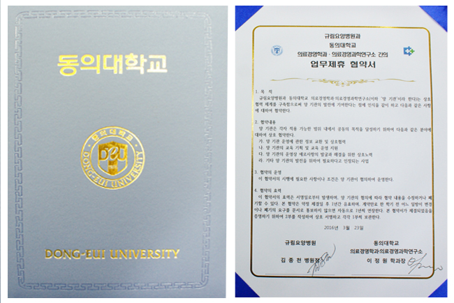 규림요양병원은 2016년 3월 23일(수) 동의대학교 의료경영학과·의료경영과학연구소와의 업무제휴협약을 체결하였습니다. <협약내용> 1. 양 기관 운영에 관한 정보교환 및 상호협약 2. 양 기관의 교육기획 및 교육 운영 지원 3. 양 기관의 운영상 애로사항의 발굴과 해결을 위한 상호노력 4. 기타 양 기관의 발전을 위하여 필요하다고 인정되는 사업 등 앞으로 의료경영 및 의료행정과 관련된 교육업무 등을 양 기관이 상호협력하여 진행할 예정입니다.