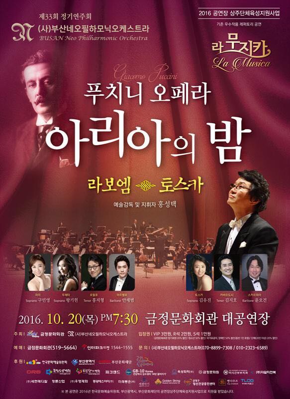 오는 10월 20일(목) 오후 7시30분, 금정문화회관 대공연장에서 (사)부산네오필하모닉오케스트라(지휘 홍성택)의 연주로 제 33회 정기연주회 『푸치니 오페라‘아리아의 밤’ 라보엠&토스카』 가 개최됩니다.