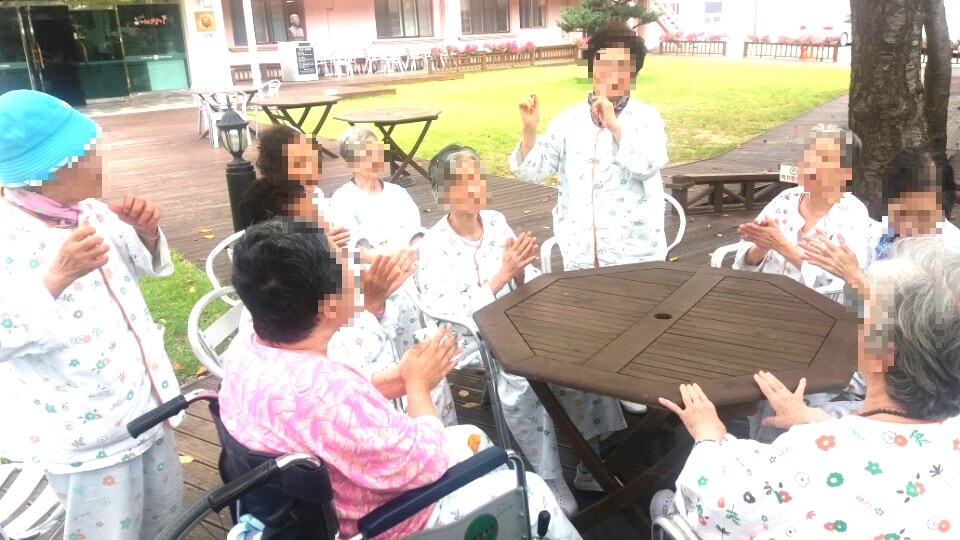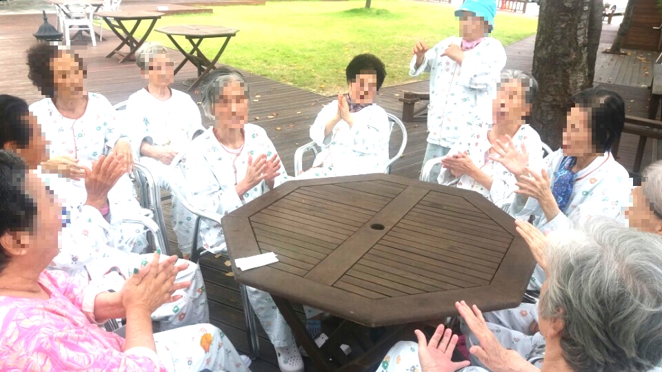 산책 후 테이블에 앉아 자유롭게 노래를 부르시고 손뼉을 치며 춤도 추시는 모습들을 볼 수  있었고 만족도가 높아