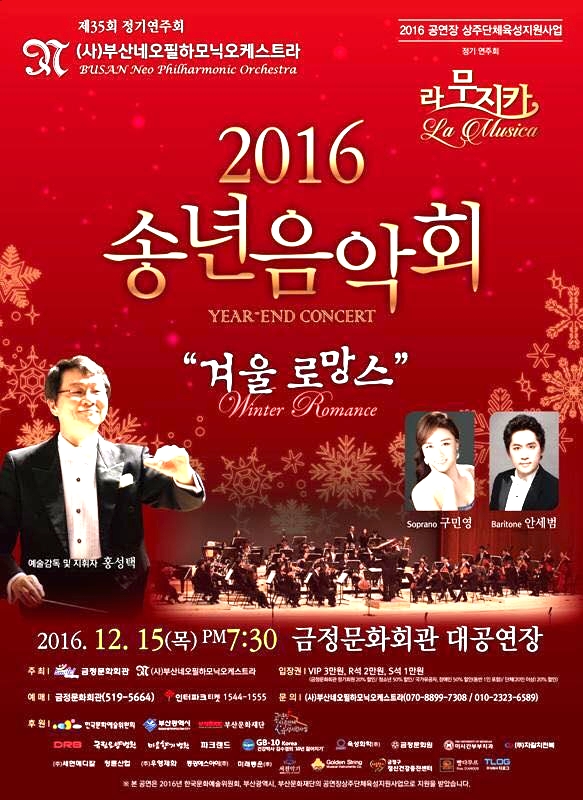 법인 송년회 관련 공지입니다 <식사> 장소: K컨벤션 웨딩홀 뷔페(금정문화회관 지하 1층) 일시: 2016년 12월 15일(목) 17~19시 <송년음악회> 장소: 금정문화회관 대공연장 일시: 2016년 12월 15일(목) 19시 30분 열심히 달려왔던 2016년 한 해를 멋진 클래식공연으로 힐링하며 다가오는 새해를 위해 재충전 하는 시간되시길 바랍니다.