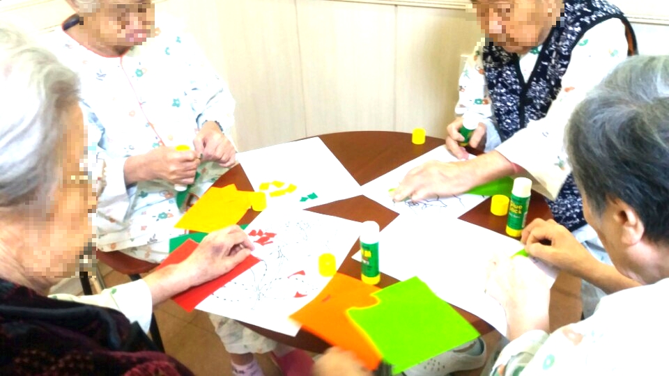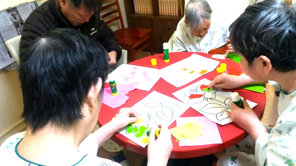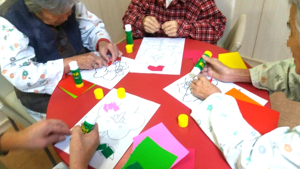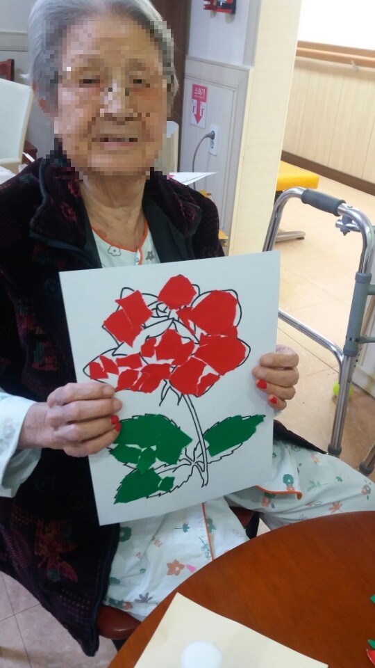 어르신들이 좋아하시는 꽃그림에 색종이를 손으로 찢어 붙여보도록 하여 색에 대한 감각을 익히고 손 감각 능력을 유지 및 향상시킬 수 있도록 하였습니다.