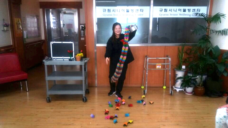 어르신들이 마술공연을 주의 깊게 관람하시고 직접 참여하시고, 공연 중간중간에 박수를 치시며 호응해주시는