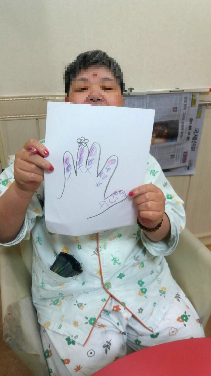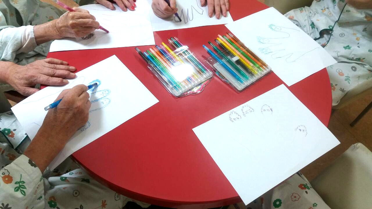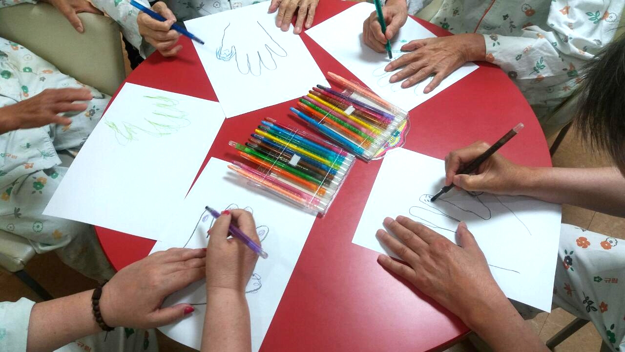 어르신들 손을 종이에 대고 색연필로 그린 뒤