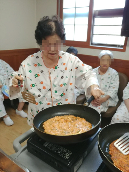 김치전만들기 우리나라 대표적인 발효음식인 김치로 김치전을 만드는 활동을 하였습니다. 식용유를 두르고, 노릇하게 구워낸 김치전이 어르신들 입맛에 맞으셨는지 모두 맛있게 드셔서 기분 좋은 활동이였습니다. 가을이 다가오는 요즘에 딱어울리는 요리였습니다. - 사회사업실 -