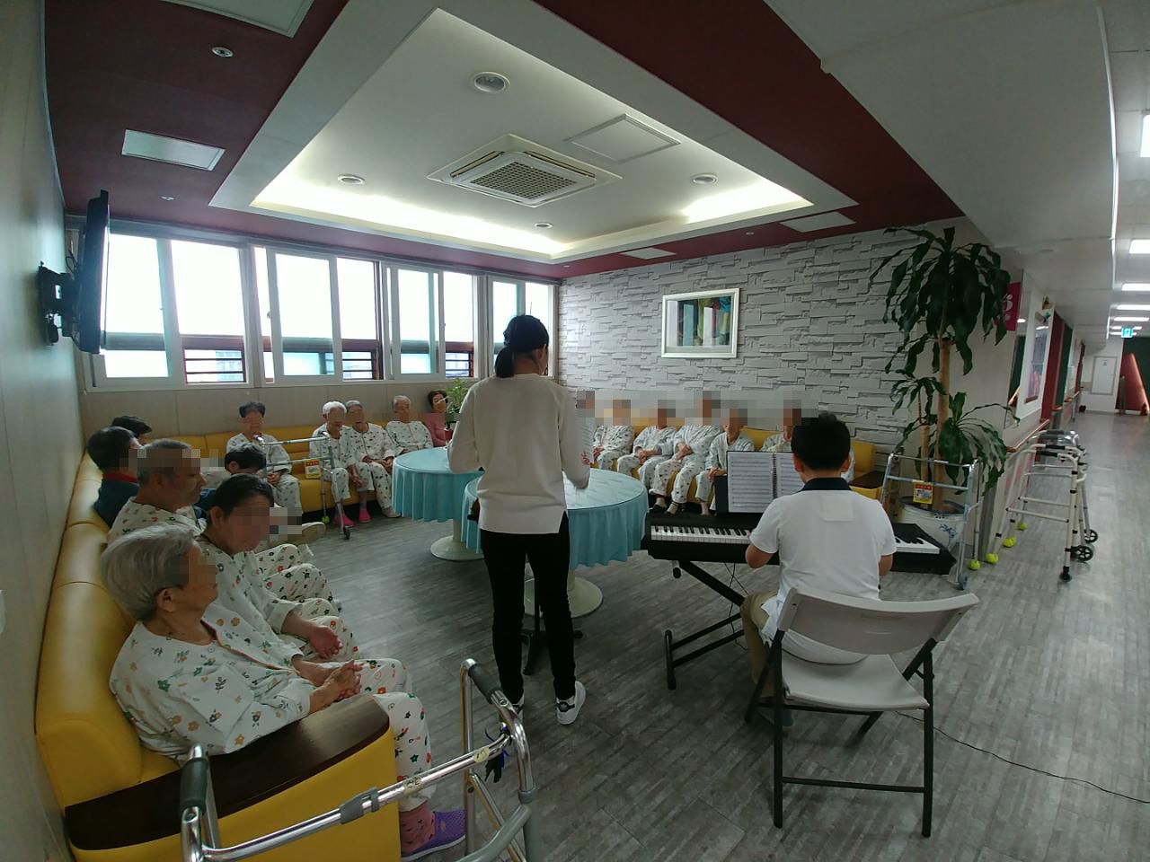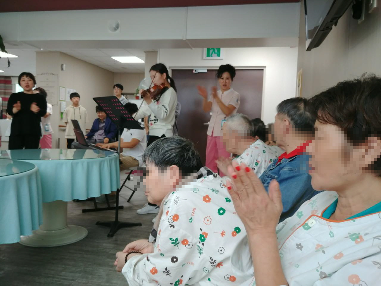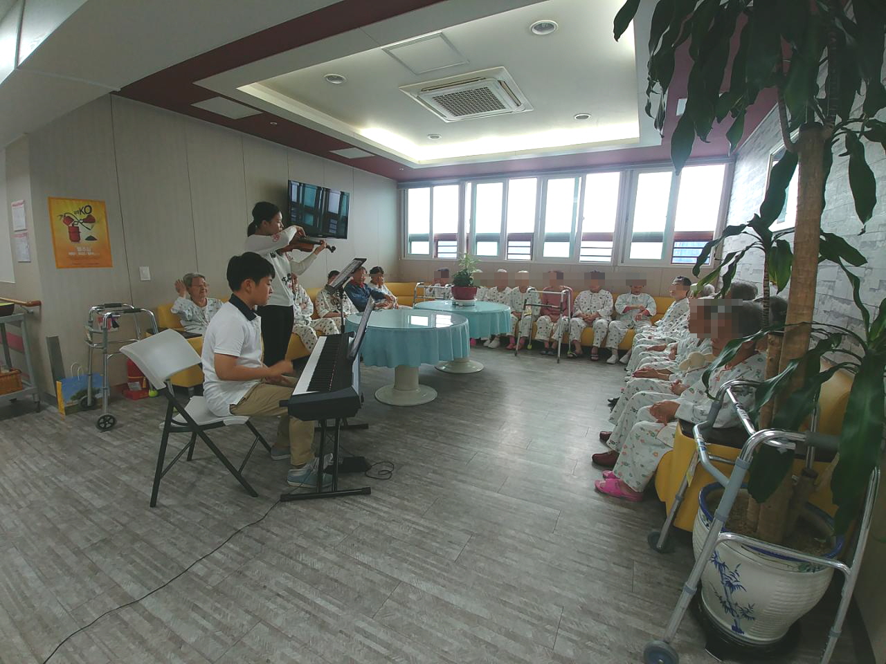 연주회 사회사업실에서는 학생봉사자들이 방문하여 바이올린,피아노 연주회가 있었습니다. 마음이 편안해지는 클래식부터 추억을 떠오르게 하는 동요까지 어르신들을 위한 맞춤공연 이였는데요. 옆에 앉은 어르신들과 박수도 치고 즐겁게 따라부르며 즐기는 행복한 공연이였습니다. - 사회사업실 -