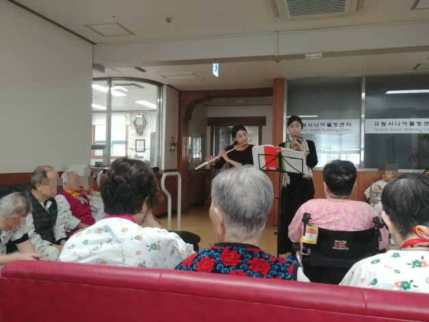클래식오보에&플룻 클래식 공연 오보에와 플룻의 클래식 공연이 있었습니다. 잔잔한 노래가 울리니 평소 병실에만 계시던 어르신도 음악소리에 이끌려 나와서 프로그램에 참여 하셨답니다. 음악을 감상하시는 어르신들이 학창시절 소년,소녀 모습 같았어요! 노래를 들으시다 문득 추억이 떠올라 눈물을 흘리시는 분도 계셨네요. - 사회사업실 -