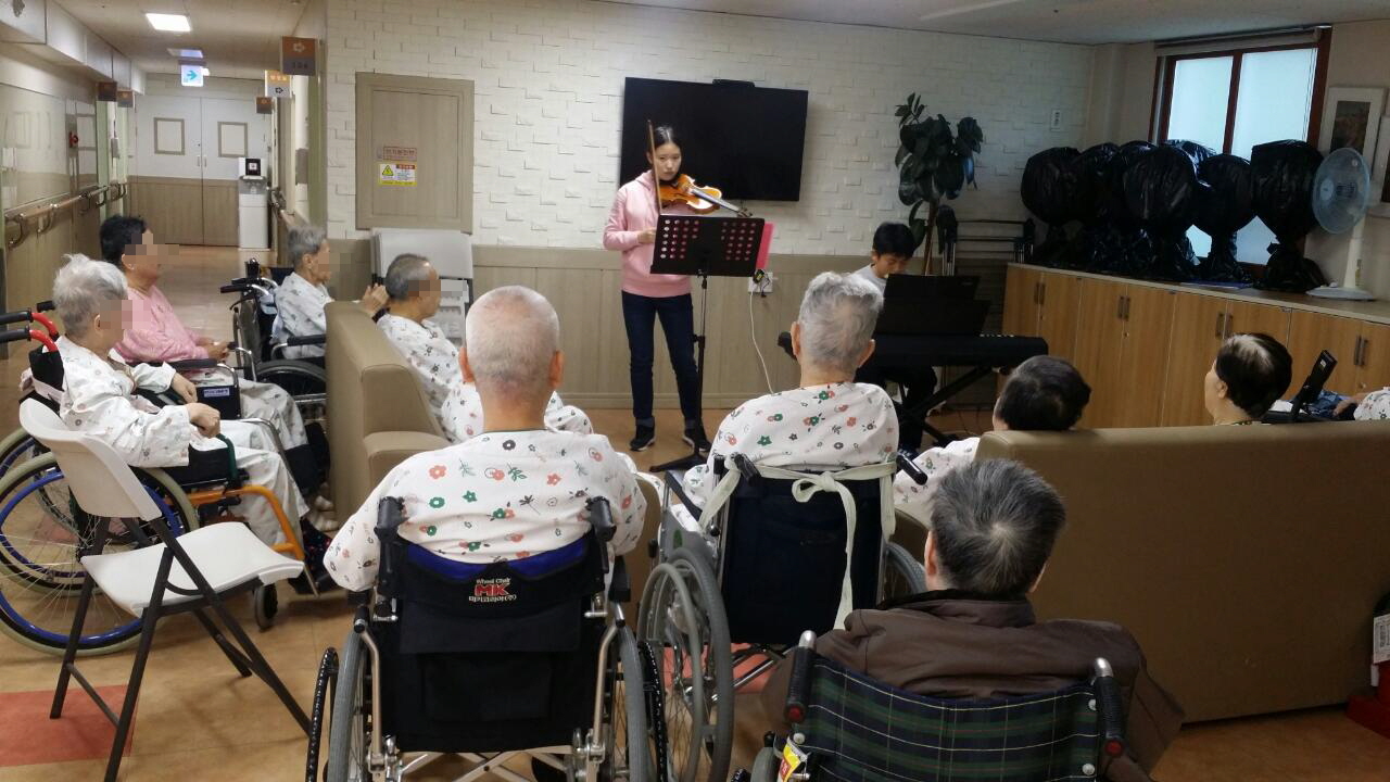 바이올린,피아노 연주회 가을날에 어르신들 을 모시고 연주회 를 했습니다 우울해 하시던 어르신들 도 노래를 따라 부르시고 하시니 마음이 흐뭇해 지는것 같아 참 좋았습니다 - 간호부 2병동 -