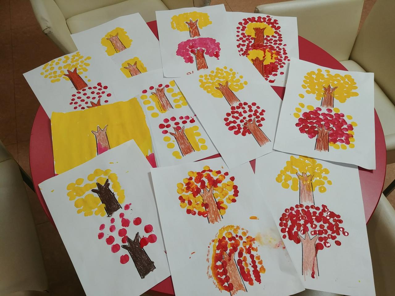 나무가지를 색연필로 칠한 후, 특별제작한 면봉에 물감을 찍어 가을 단풍을 표현해보았습니다.